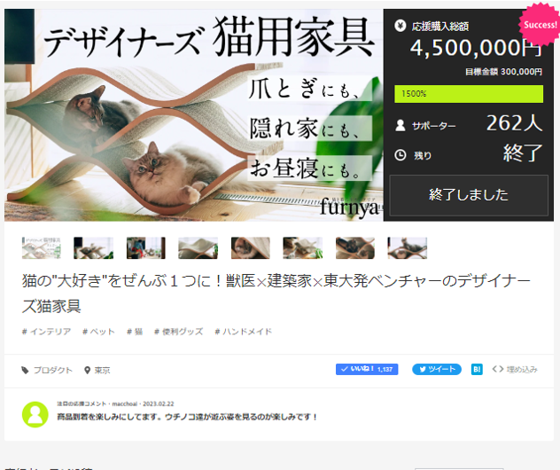 自社商品Cat Cellarは全く新しいコンセプト、初回のプロジェクトでありながら支援総額450万円(達成率1500%)を記録しています。これにはインフルエンサーを巻き込んだマーケティング、緻密なマーケットリサーチなど自社で一貫して行っています。